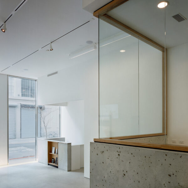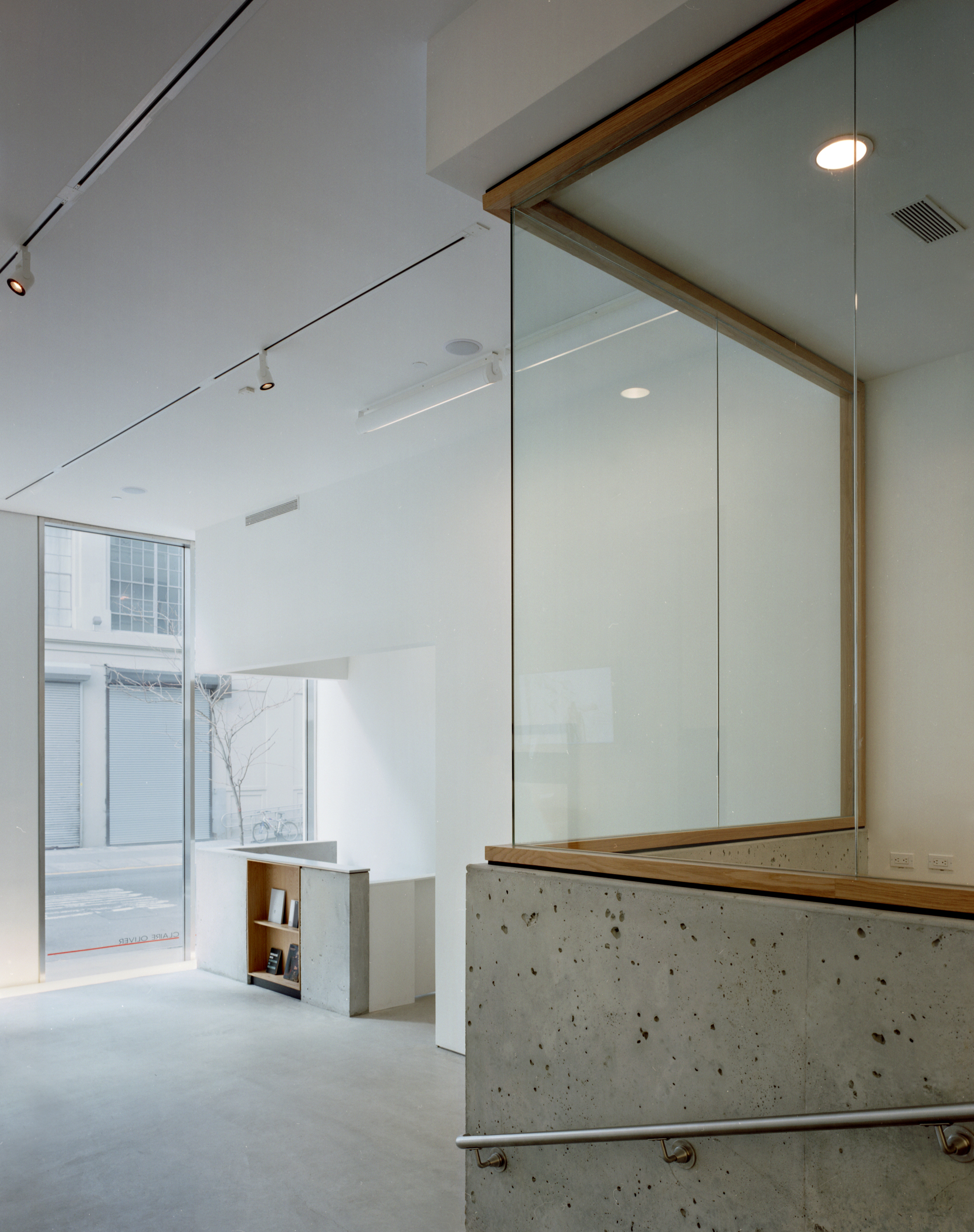 COFA: This build-out required converting a former parking garage into a minimal yet highly detailed gallery space. Architecture details include poured-in-place concrete walls and an interior stair with custom wood-and-glass partitions.