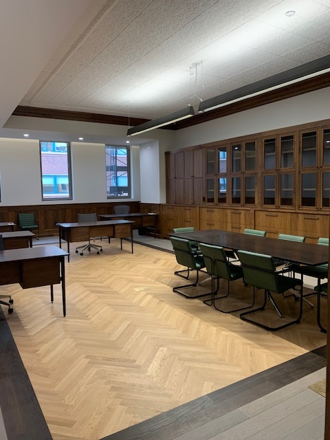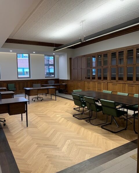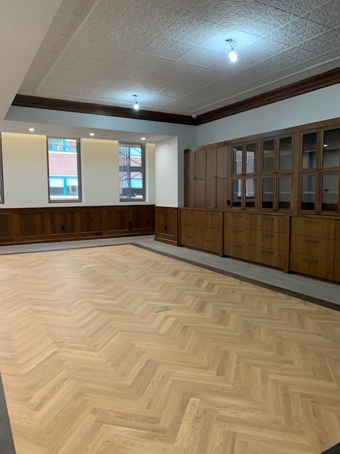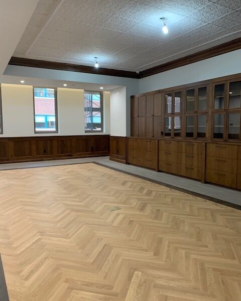 Herringbone Hardwood Flooring The principal spaces feature a striking herringbone-pattern hardwood floor installation in light natural oak. The precision of the herringbone layout, bordered by a contrasting inlay detail, lends elegance to the open plan and complements the warmth of the walnut millwork.