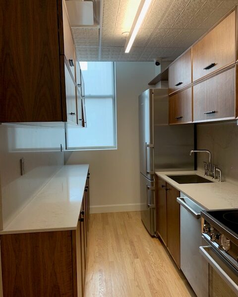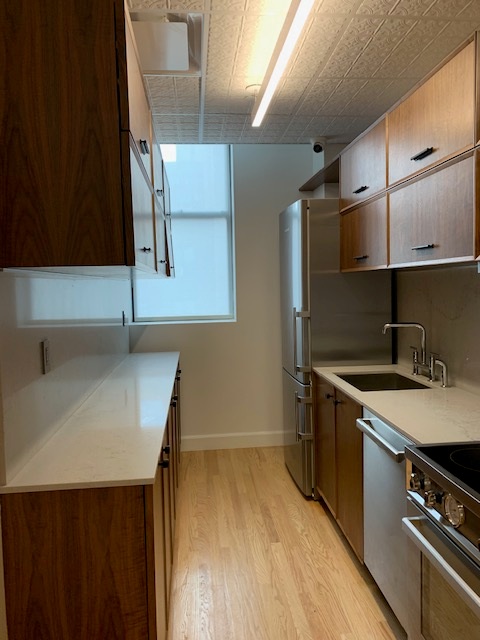Kitchen Renovation The kitchen renovation features a galley-style layout with new custom cabinetry in warm wood tones, quartz countertops, and stainless steel appliances including a full-height refrigerator, integrated range, and under-counter dishwasher. A deep undermount sink with a professional-style faucet completes the functional workspace.