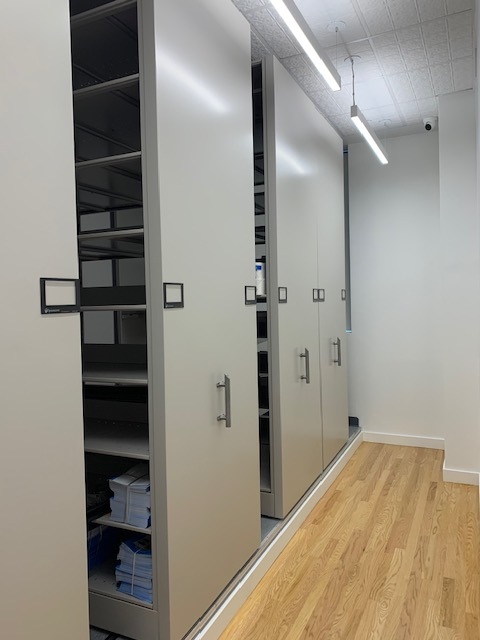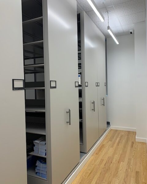High-Density Mobile Storage System A high-density sliding storage system was installed in the dedicated records area. Floor-mounted tracks accommodate multiple tall cabinet units that slide laterally to maximize storage capacity while minimizing footprint. The system includes adjustable interior shelving with label-holder frames and is finished with clean white laminate exteriors and brushed metal hardware.